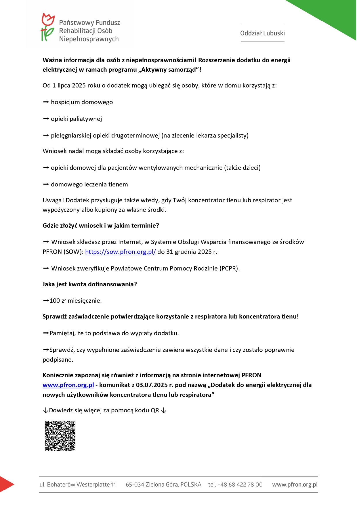 Koniecznie zapoznaj się również z informacją na stronie internetowej PFRON www.pfron.org.pl - komunikat z 03.07.2025 r. pod nazwą „Dodatek do energii elektrycznej dla nowych użytkowników koncentratora tlenu lub respiratora”